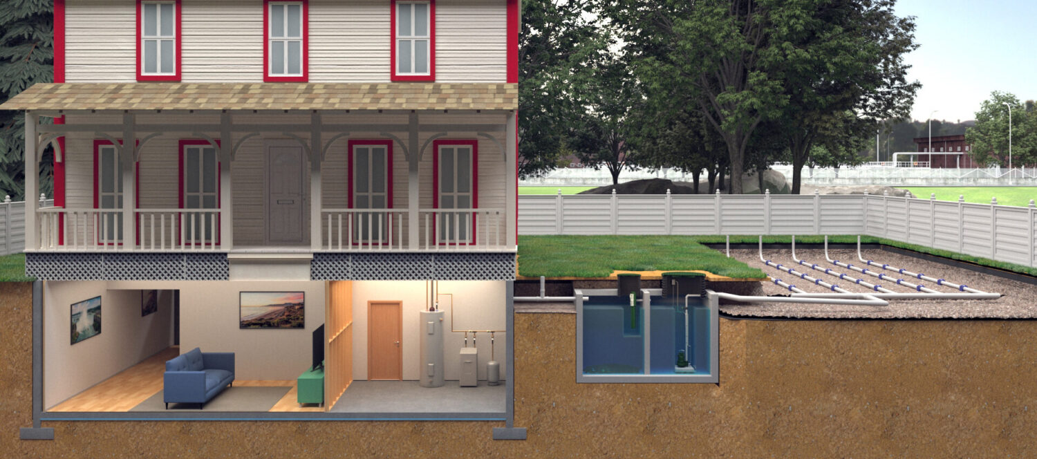 L'eau indésirable et les eaux usées brutes sont pompées vers un bassin extérieur. Les pompes des stations de relevage remontent et évacuent ces eaux usées.